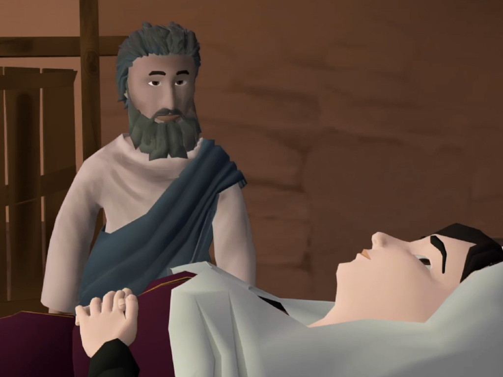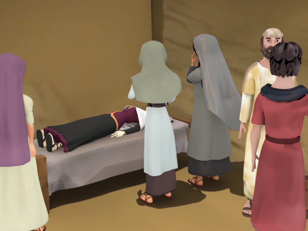 Um die Zeit von Petrus‘ Besuch wurde sie schwer krank und starb. Ihr Leichnam wurde gewaschen und zur Beerdigung in einem Raum im Obergeschoss aufgebahrt. – Folie 4