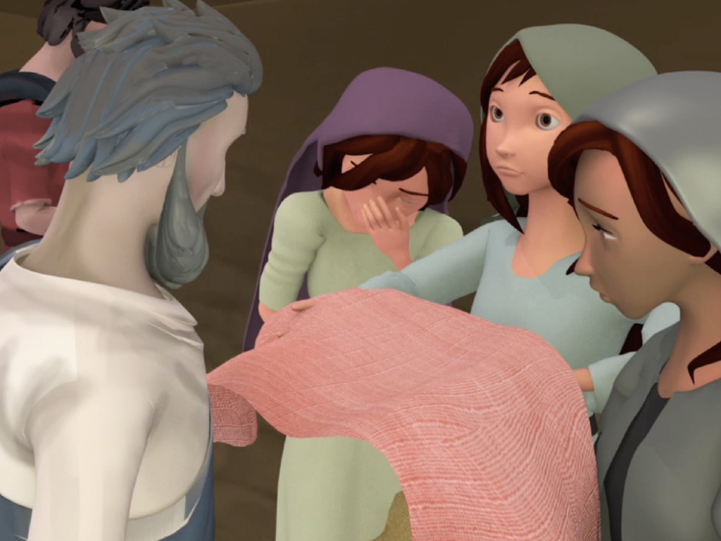 Alle Witwen standen um Petrus herum. Sie weinten und zeigten ihm die Kleider und die anderen Kleidungsstücke, die Tabita zu Lebzeiten gemacht hatte. – Folie 9