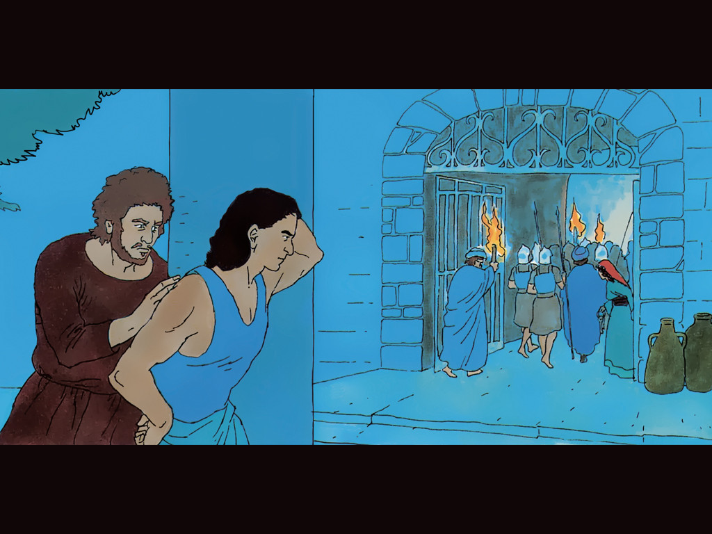 Jesus wird zum Hohepriester geführt, dem Oberhaupt aller jüdischen Führer. Petrus und Johannes folgen ihm in einiger Entfernung. – Folie 1