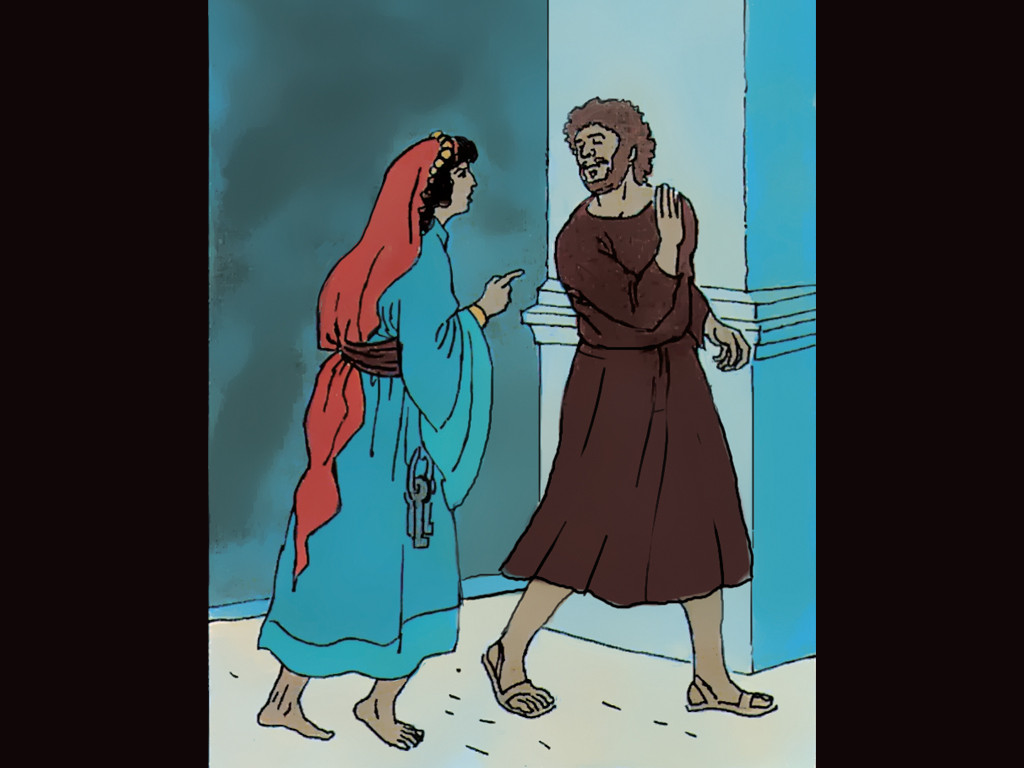 Eine Dienerin, die im Hof ​​Dienst hat, fragt: „Warst du nicht mit Jesus von Galiläa zusammen?“<br/>Petrus: „Nein! Ich kenne den Mann gar nicht.“ – Folie 3