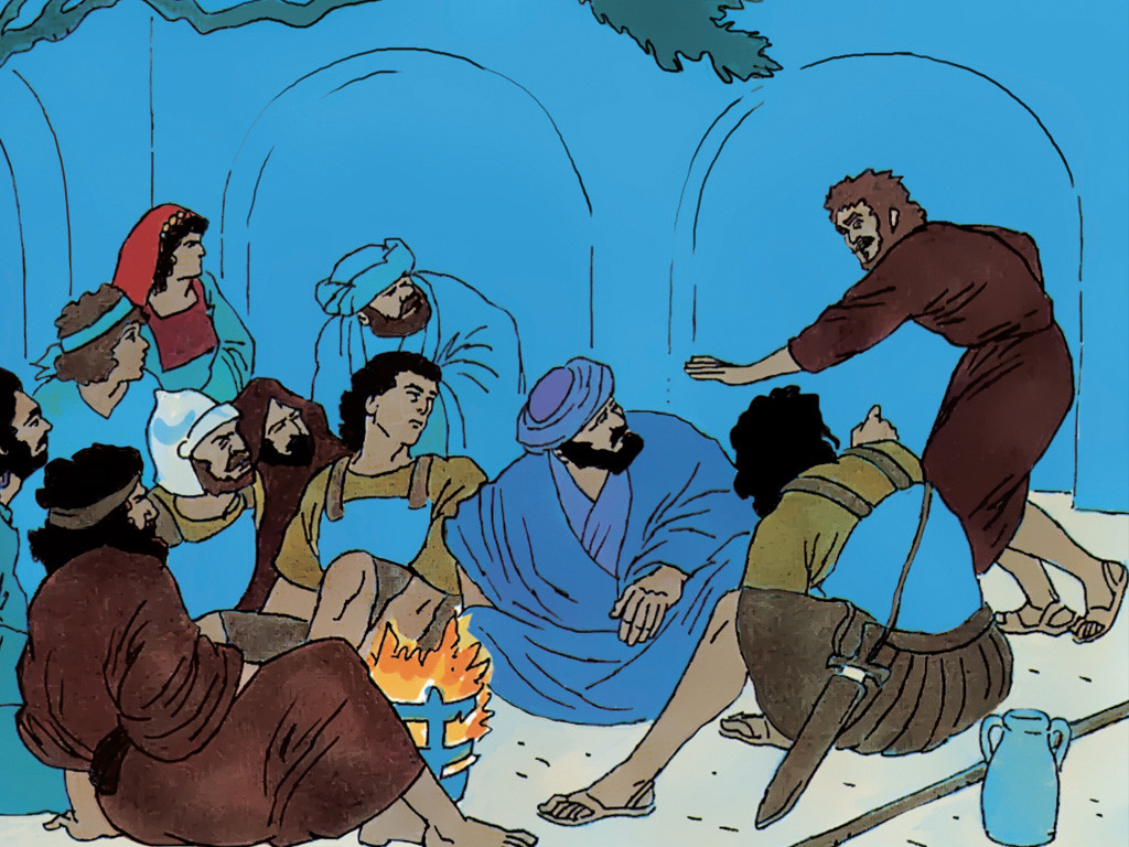 Eine Stunde später sagt ein Verwandter des Dieners des Hohepriesters (dem Petrus ein Ohr abgeschnitten hatte): „Ich bin sicher! Du warst mit Jesus dort! An deinem Akzent erkenne ich, dass du ein Galiläer bist!“<br/>Petrus: „Ich weiß nicht, wovon du redest.“ – Folie 5