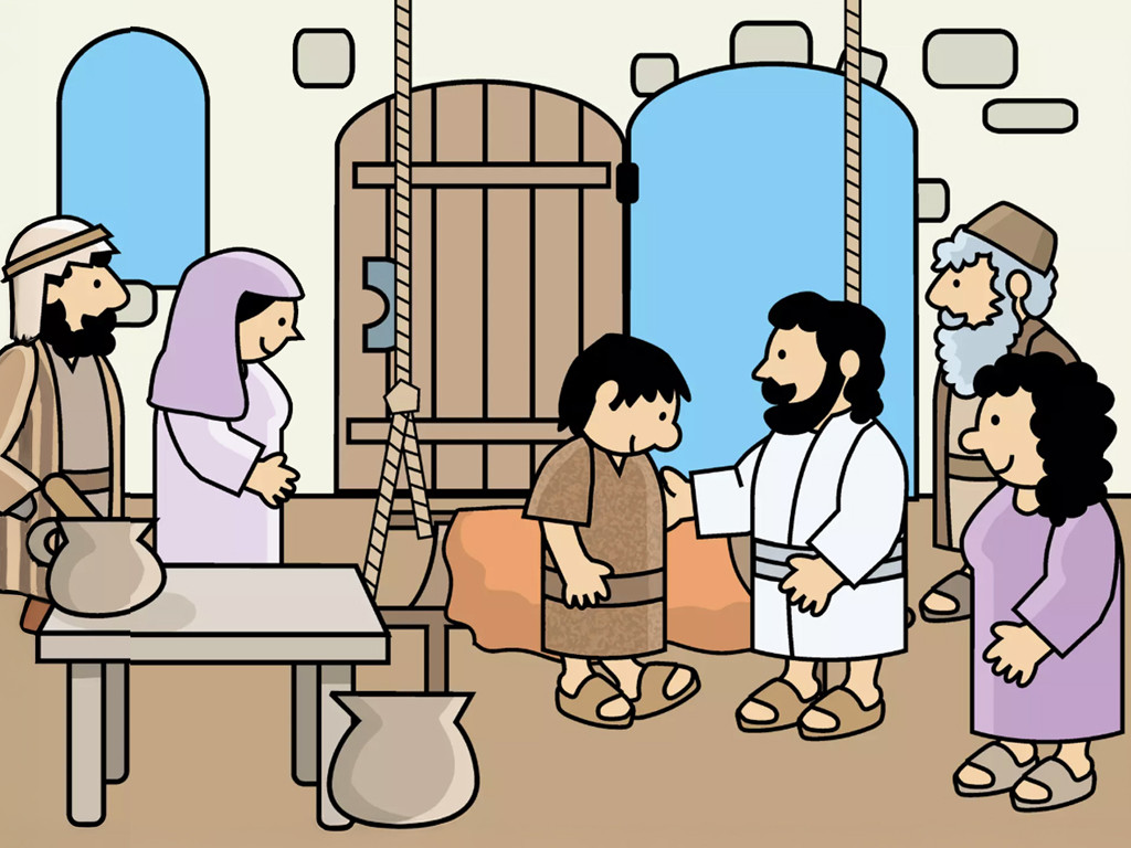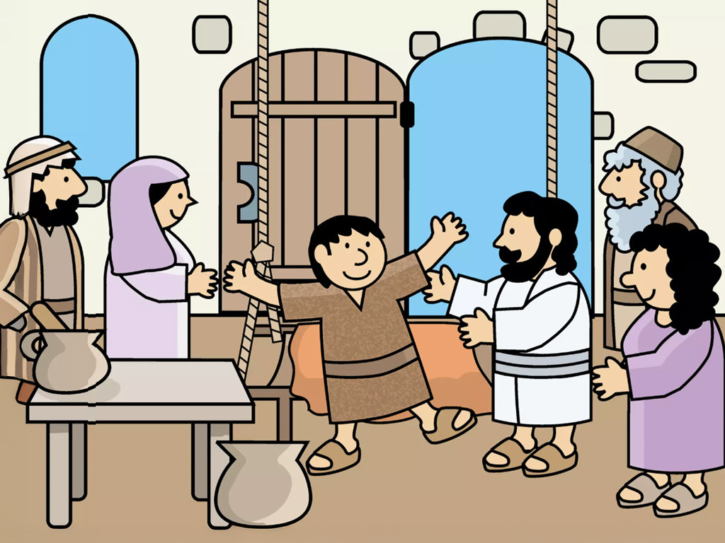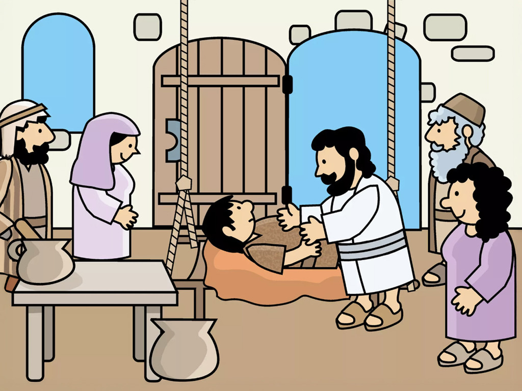 Jesus freute sich, dass diejenigen, die ihren lahmen Freund trugen, daran glaubten, dass er ihren Freund heilen konnte. „Steh auf und geh“, sagte Jesus zu dem Kranken. – Folie 8